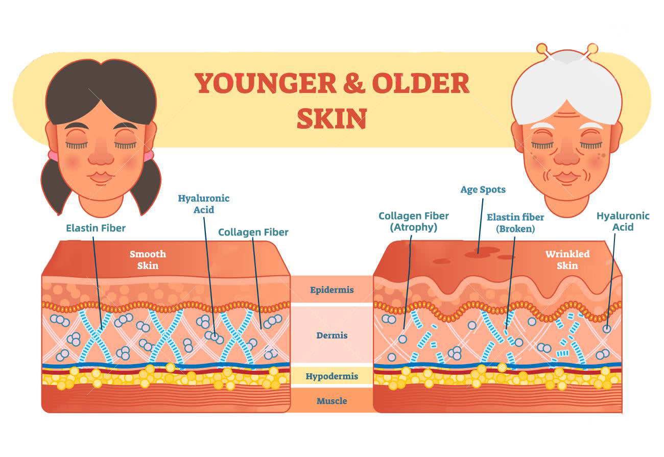 Skin aging and pigmentation changes, such as age spots, arise from a combination of natural aging processes, sun exposure, and lifestyle factors. As we age, the skin's collagen and elastin production decreases, resulting in reduced firmness and elasticity. Prolonged exposure to UV rays accelerates this decline, leading to photoaging and pigmentation issues. Environmental stressors and hormonal changes, particularly during menopause, also affect skin hydration and texture.
